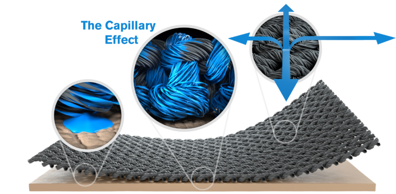 As surface tension and capillary action work together, sweat is pulled away from the body to the fabric’s exterior, where it spreads out to increase surface area and dry faster.